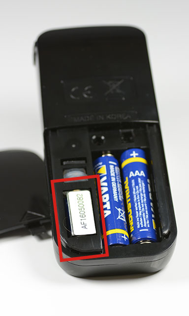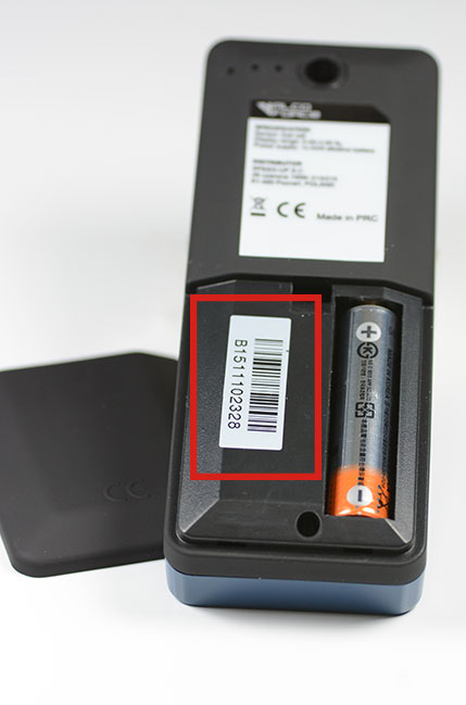 Sériové číslo najdete na několika místech: na Alkohol testeru, pod krytem baterie, pod baterií, ukázkové foto: